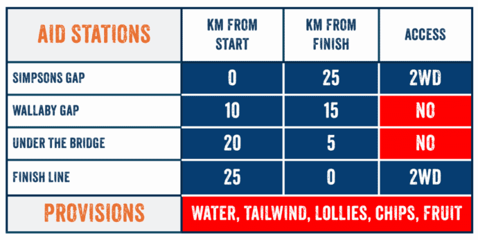 And that is most of the hard work done except that you might be a little tired by this point. From here you have about 12km of mainly downhill but still at times technical track to trot along to reach the Alice Springs Telegraph Station. On the way, we’ve snuck in another aid station at the Geoff Moss Bridge, about 5km from the finish line. You will most likely integrate with competitors who are running the longer 231km, 128km or 65km races, and have been on the trail for a number of hours or even days at this point. Support these people and provide all the encouragement you can. It is these experiences that make this event unique.