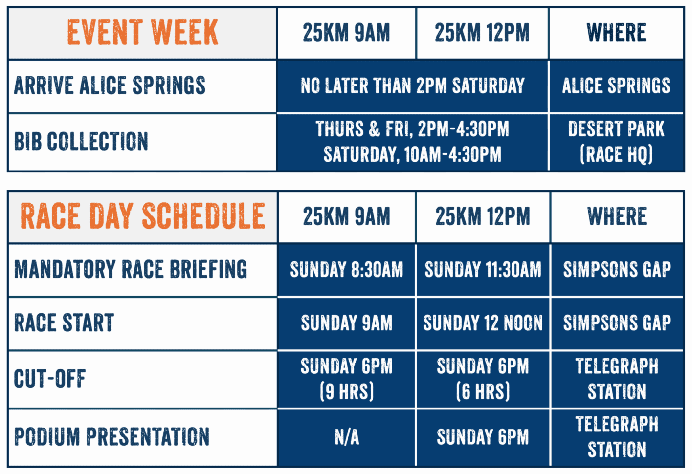 | Race start | Sunday 9am | Sunday 12 noon |