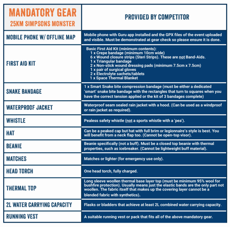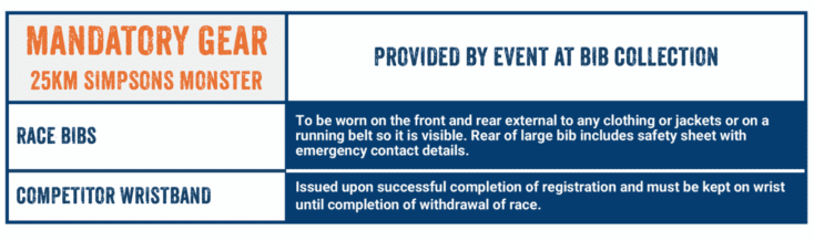 All 25km entrants must carry the mandatory gear as per the list below and submit their completed 25km Mandatory Gear Declaration Form when collecting their Race Bib.